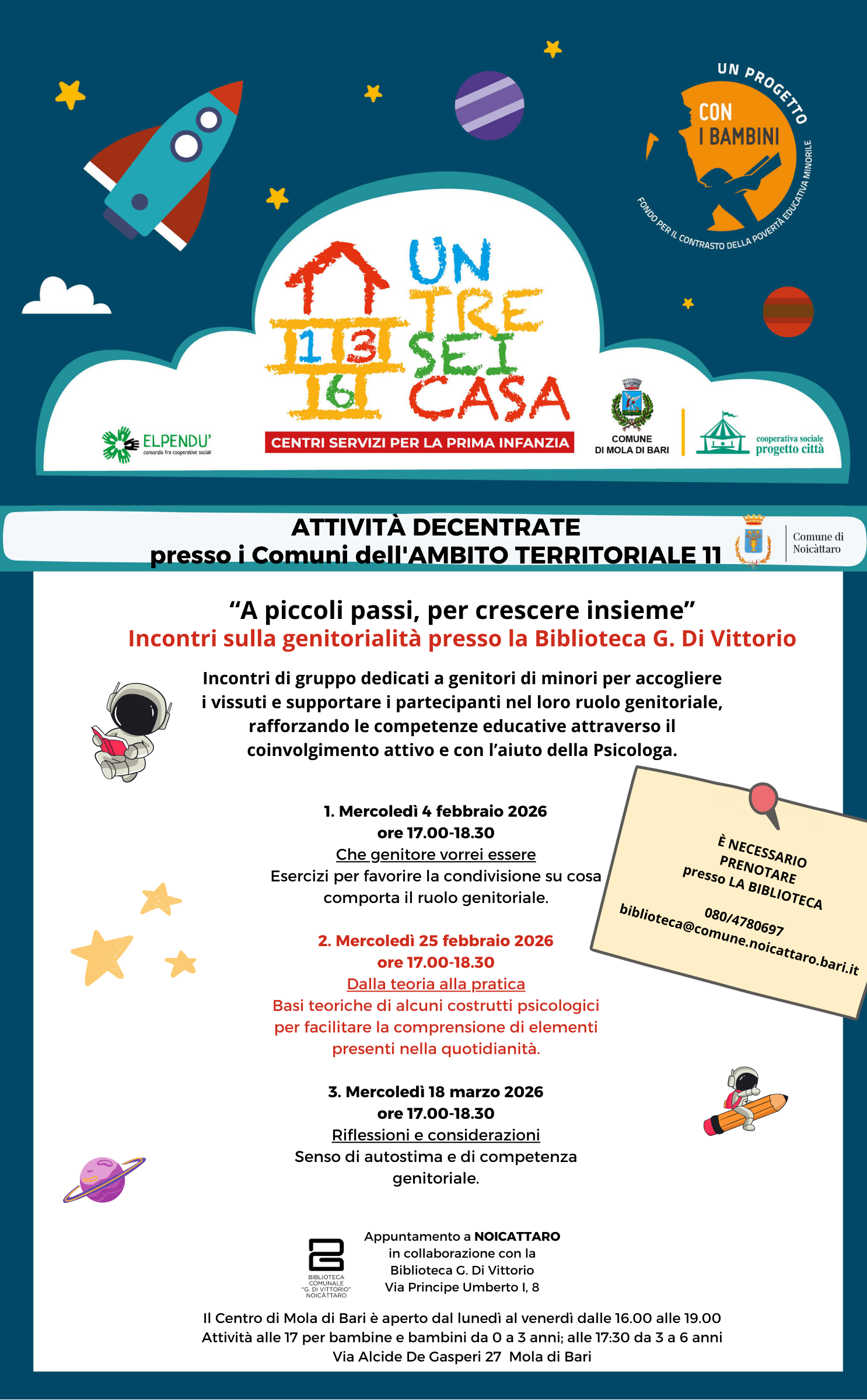 Con il nuovo anno, riprendono gli incontri di gruppo dedicati ai genitori sul tema delle competenze educative a cura del Centro Servizi per la Prima Infanzia - Progetto "Un, tre, sei Casa" presso la Biblioteca G. Di Vittorio di Noicattaro.